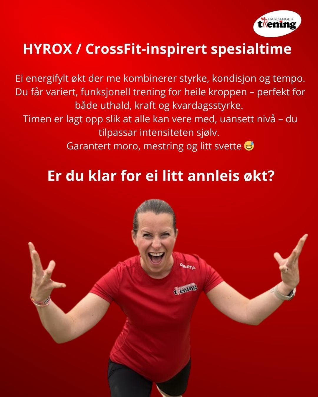 HYROX/CrossFit-inspirert spesialtime, der me kombinerer styrke, kondisjon og tempo i ei energifylt økt. Øvingane vert inspirerte av funksjonell trening og kan til dømes vere: